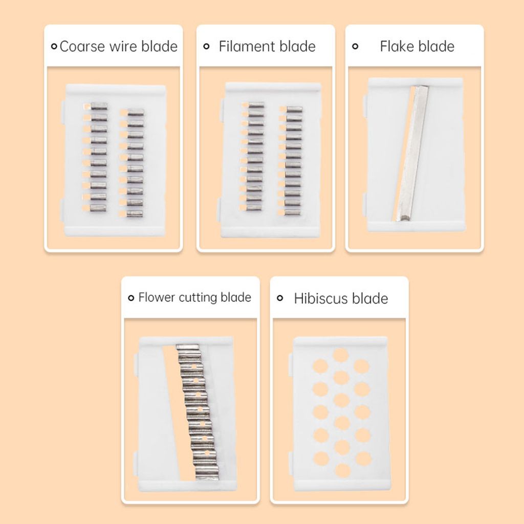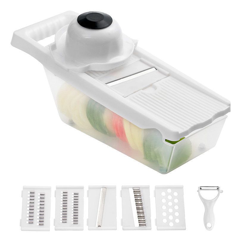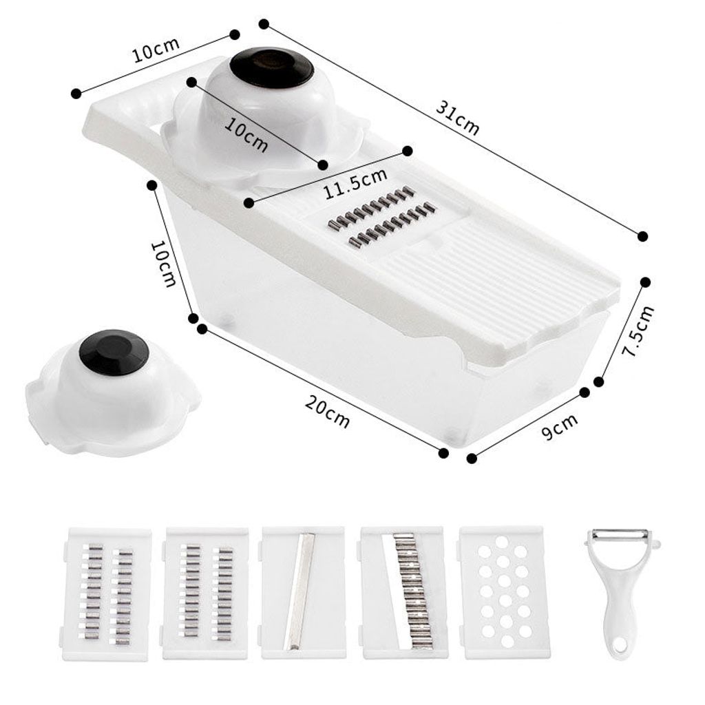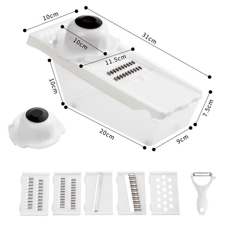 - Cutter body + 5 Knives + Hand-guard + Small peeler
