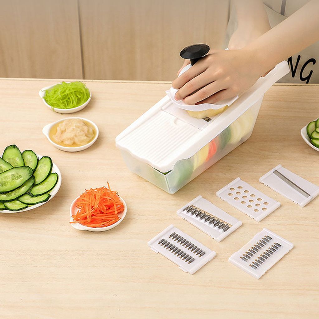 - Function: 1.Cut thin slices 2.Cut thick slices 3.Cut flower slices 4.Cut fine shreds 5.Cut thick shreds 6.Grind garlic and ginger 7.Separate egg yolk and egg whites 8.Store vegetables 9.Wash vegetables and drain 10.Scoop water 11.Safety hand guards